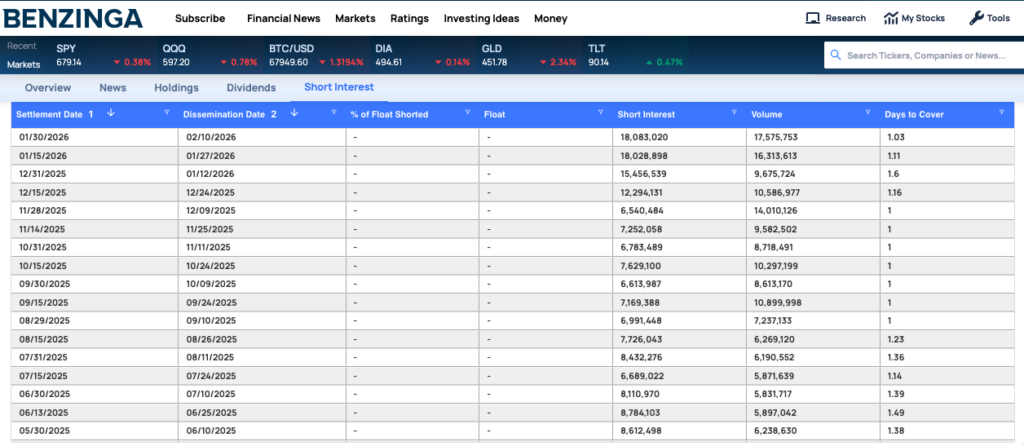 At the same time, short interest in the Invesco QQQ Trust (NASDAQ:QQQ) has moved in the opposite direction. Shares sold short have fallen from nearly 54 million last summer to about 46 million, signaling that bearish bets against the broader Nasdaq are being unwound.