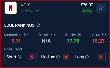 Benzinga Edge Stock Rankings shows that Netflix has a weak price trend over the short, medium and long term. Its momentum ranking was poor at the 7th percentile, whereas its quality ranking was at the 78th percentile. Benzinga’s screener allows you to compare Netflix’s performance with its peers.