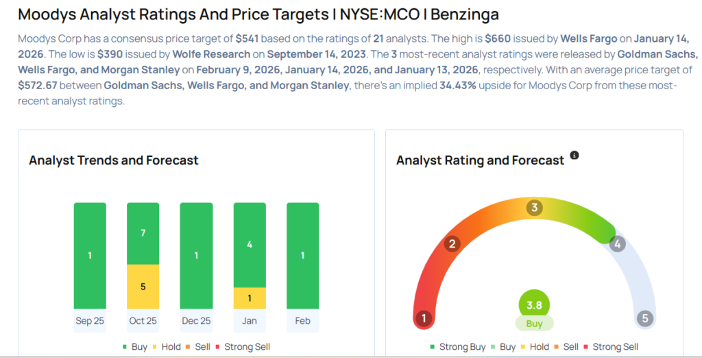 Analysts expect the New York-based company to report quarterly earnings at $3.44 per share. That’s up from $2.62 per share in the year-ago period. The consensus estimate for Moody’s quarterly revenue is $1.87 billion (it reported $1.67 billion last year), according to Benzinga Pro.