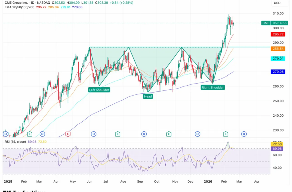 The neckline at $285-$290 has been decisively broken, with CME now trading well above it. The measured move target projects to $310-$320 based on the pattern’s depth.