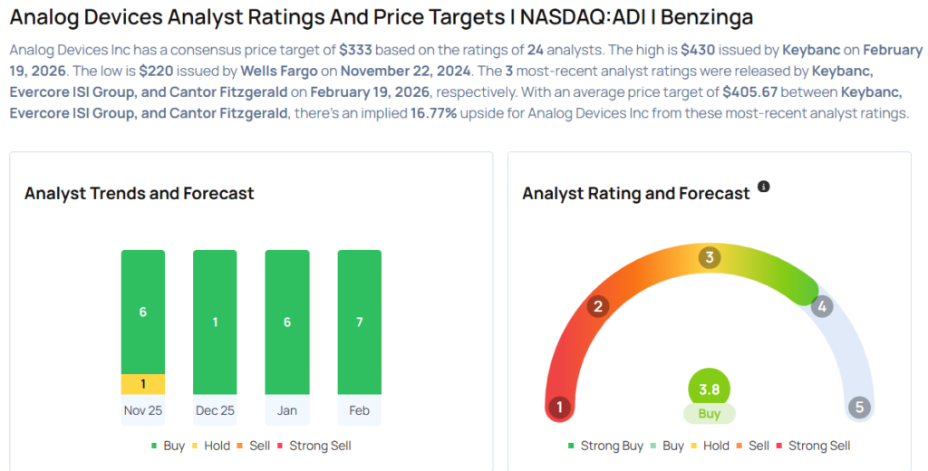 Analog Devices expects fiscal second-quarter 2026 revenue of $3.40 billion-$3.60 billion, above the analyst consensus estimate of $3.23 billion. The company projects quarterly adjusted EPS of $2.73-$3.03 above the analyst consensus estimate of $2.46.