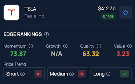 TSLA continues to show a stronger long-term price trend, but its short and medium-term trend remains negative, alongside a weak value ranking, according to data from Benzinga’s Edge Stock Rankings.