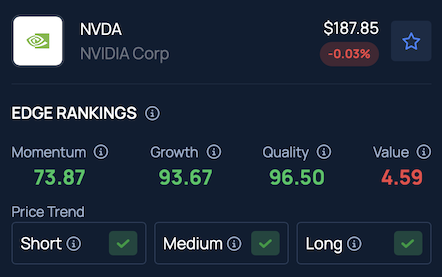 NVIDIA continues to show a solid price trend across the short, medium and long term, though it carries a weak value rating, according to additional metrics from Benzinga’s Edge Stock Rankings.