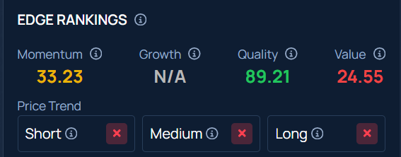 The stock exhibits weakening price momentum across short-, medium-, and long-term horizons, yet earns a high Quality score in Benzinga’s Edge Stock Rankings.