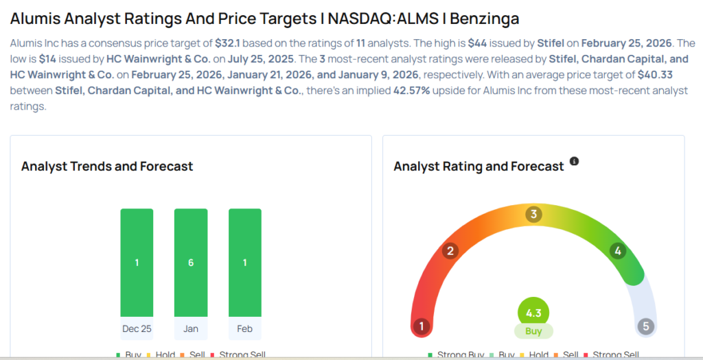 - Stifel analyst Alex Thompson initiated coverage on Alumis Inc (NASDAQ:ALMS) with a Buy rating and announced a price target of $44. Alumis shares closed at $28.08 on Tuesday. See how other analysts view this stock.