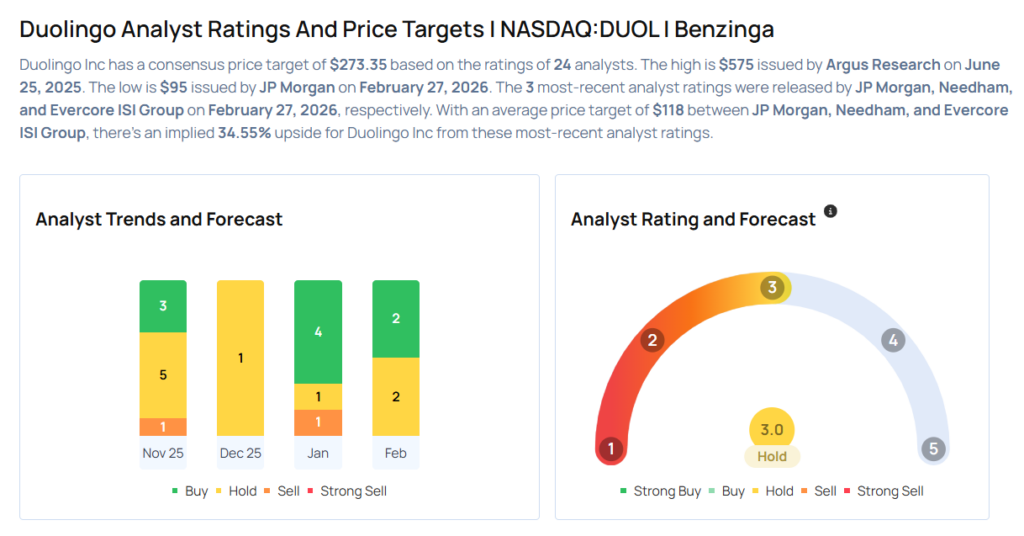 • JP Morgan analyst Bryan Smilek downgraded Duolingo from Overweight to Neutral and lowered the price target from $200 to $95.