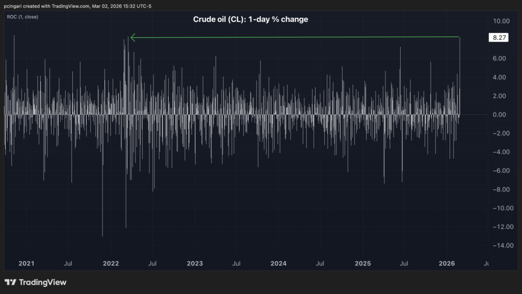 Crude oil — tracked by the United States Oil Fund (NYSE:USO) — surged 8.3% to $72.50 per barrel, marking its largest single-day gain since March 2022, when Russia’s invasion of Ukraine propelled prices above the $100 level.
