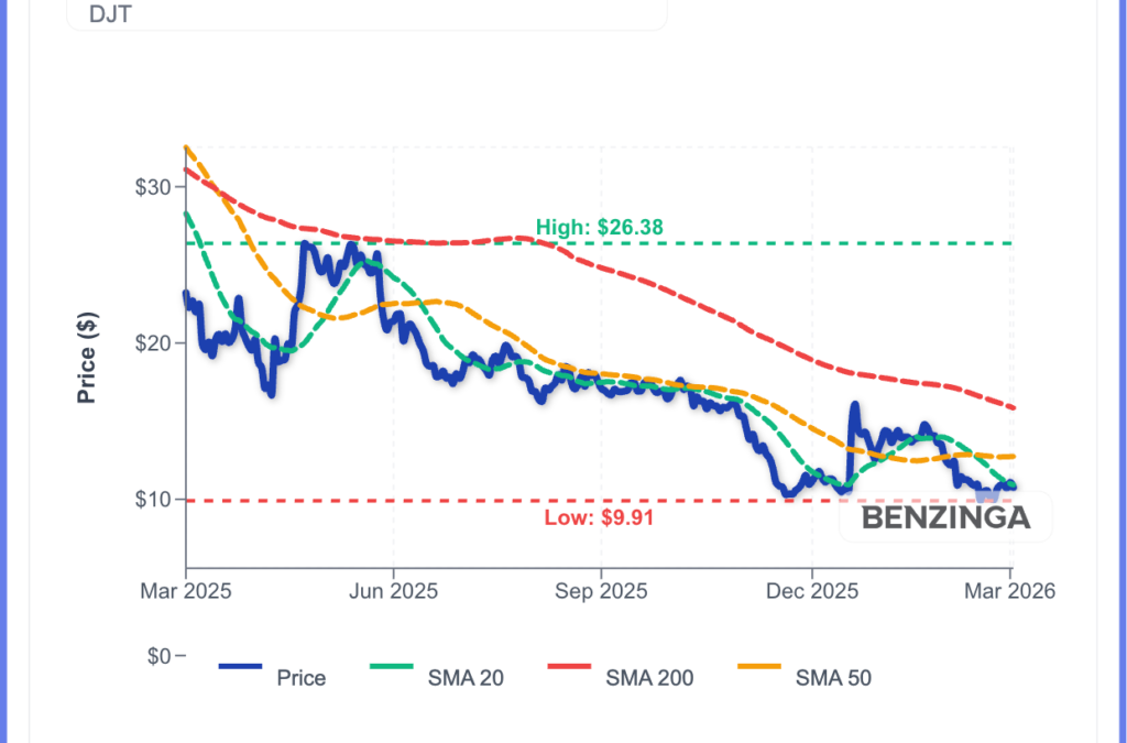 DJT Price Action: Trump Media & Tech Gr shares were down 2.62% at $10.80 at the time of publication on Tuesday. The stock is near its 52-week low of $9.89, according to Benzinga Pro data.