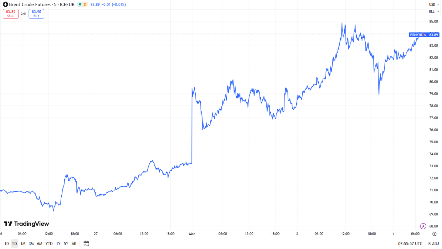 Oil prices rose 4.2% on Wednesday as the US–Israeli campaign against Tehran heightened fears of supply disruption. Brent is up around 18% over the past week.
