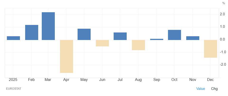 The Euro Area economy expanded by 1.3% year-on-year in the final quarter of 2025. That marked its slowest pace in a year. Euro Area industrial production declined by 1.4% month-on-month in December 2025, reversing a downwardly revised 0.3% increase in November.
