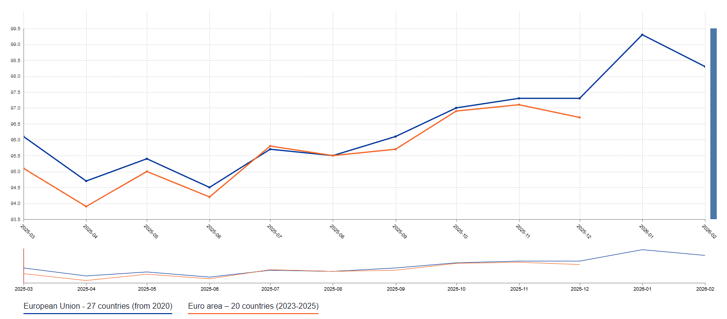 Escalation in the Middle East would further erode confidence in the Euro Area economy. The region’s Economic Sentiment Indicator fell to 98.3 in February 2026, down from a three-year high of 99.3 in January.