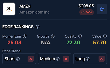 Benzinga’s Edge Stock Rankings indicate that AMZN has a negative price trend across short, medium and long term, with the Value ranking in the 72nd percentile.