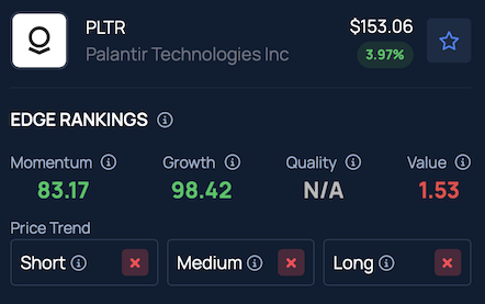 According to Benzinga Edge Stock Rankings, PLTR shows a negative price trend across short, medium and long-term periods, with a Growth ranking in the 78th percentile.