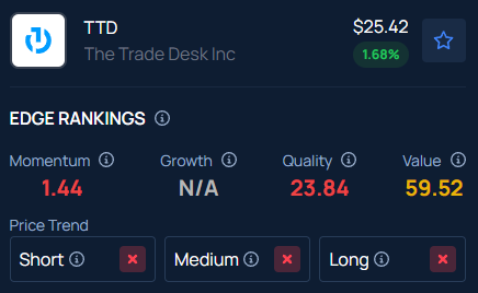 Benzinga’s Edge Stock Rankings indicate that TTD stock has a negative price trend across all time frames.