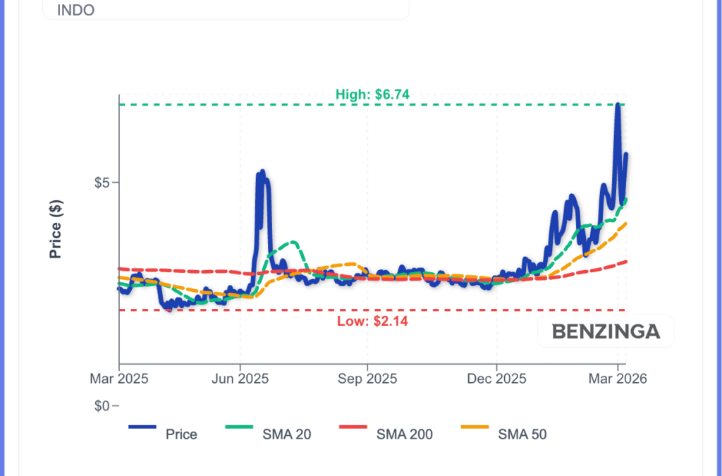 Shorter-term simple moving averages (20- and 50-day) have turned up for INDO and moved above the longer-term 200-day average, confirming strengthening upside momentum.