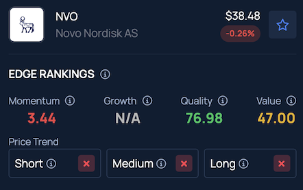 Benzinga’s Edge Stock Rankings show that Novo Nordisk is exhibiting weakness across the short, medium, and long-term, although its Quality score ranks in the 76th percentile.