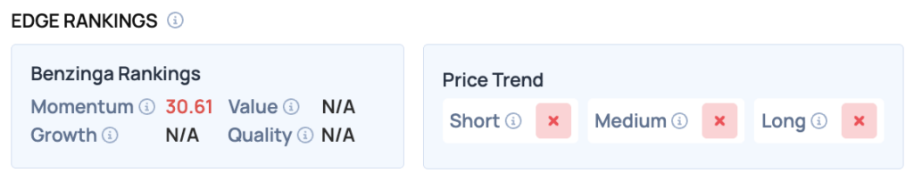 Benzinga Edge data shows SBET with a Momentum score of 30.61, while its short-, medium- and long-term price trends all flash bearish signals.