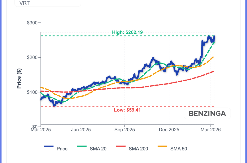 VRT Price Action: Vertiv Holdings shares were up 8.56% at $262.48 at the time of publication on Monday. The stock is trading near its 52-week high of $264.86, according to Benzinga Pro data.