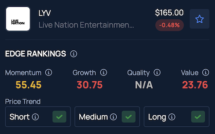 Live Nation continues to show a strong price trend across the short, medium and long-term periods, although its valuation ranking remains weak, according to Benzinga Edge Stock Rankings.