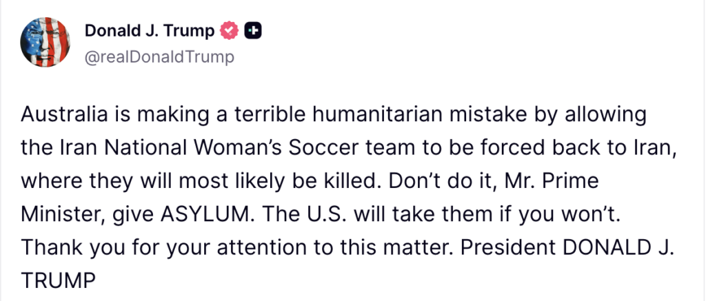 “Australia is making a terrible humanitarian mistake by allowing the Iran National Woman’s Soccer team to be forced back to Iran, where they will most likely be killed,” Trump wrote on Truth Social. “Don’t do it, Mr. Prime Minister, give ASYLUM.”
