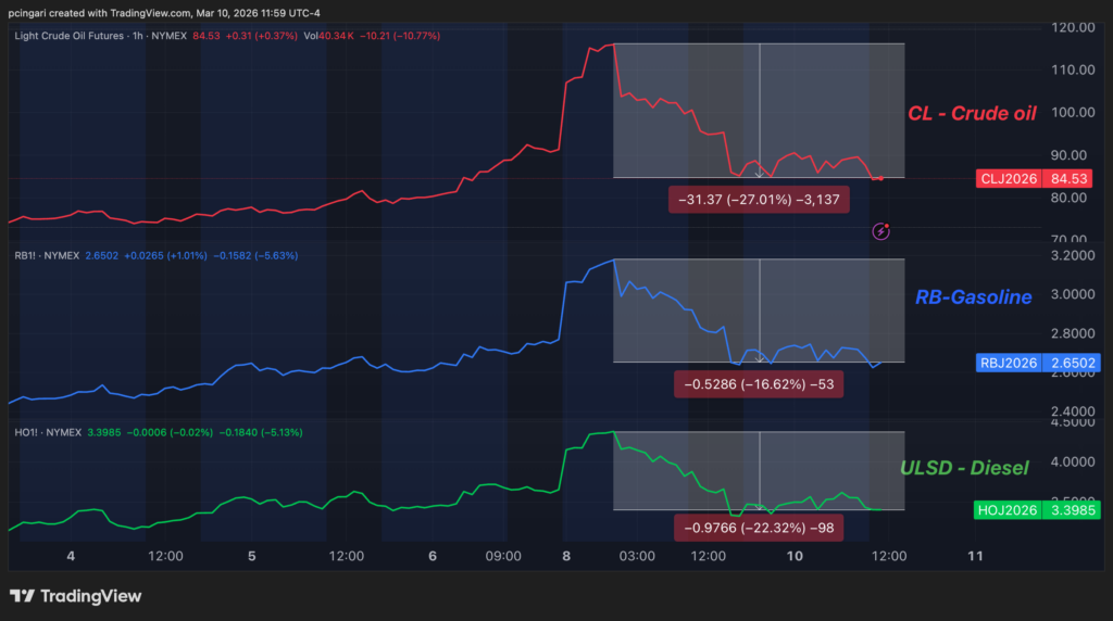 By Tuesday, following President Donal Trump‘s Monday evening press conference declaring the campaign “pretty well complete” and pledging open oil lanes, WTI had retreated all the way to around $84 — a drop of nearly 30% from peak in under 48 hours, the most volatile high-to-low swing in crude since April 2020.