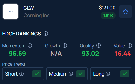 With a strong Momentum in the 96th percentile, Benzinga’s Edge Stock Rankings indicate that GLW has a positive price trend across all time frames.