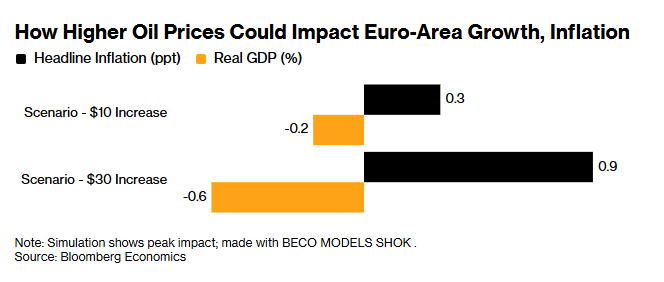 “The US-Israeli strike on Iran and Tehran’s retaliation have already sent oil toward $80 a barrel, from a pre-escalation average of $65,” Bloomberg economists Jamie Rush, Björn van Roye, and Ziad Daoud wrote. “European gas prices have also moved higher. Running these scenarios through our in-house economic model shows that CPI will be up and GDP down across major advanced economies, triggering conflicting impulses for central banks.”