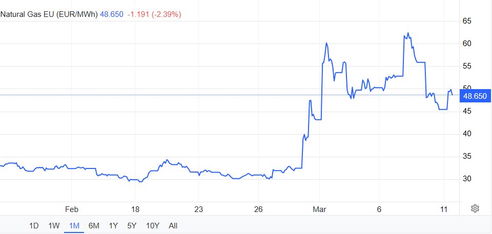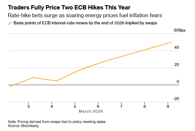 Traders have increased their bets on interest-rate hikes from the ECB after European natural gas prices doubled and Brent crude rose 26% since February 27, a day before the military operations began. Swaps imply around a 70% probability of two 25-basis-point rate increases by the ECB this year, up from the single move priced on Friday, Bloomberg reported.