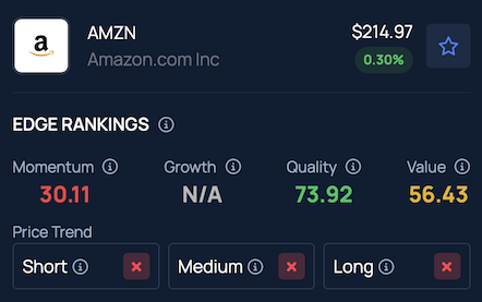 According to Benzinga’s Edge Stock Rankings, AMZN shows a negative price trend across the short, medium and long term, while its Quality score ranks in the 73rd percentile.