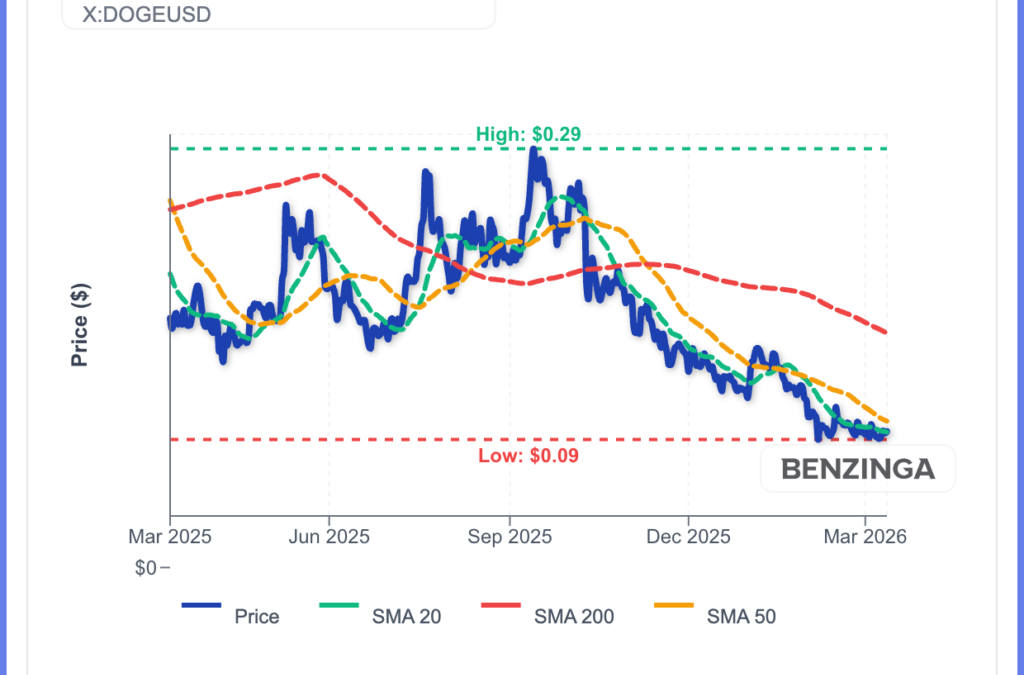 Dogecoin dropped roughly 60% over five months from $0.23 in October 2025 to current levels.