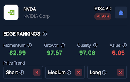 Benzinga Edge Stock Rankings shows that NVDA is experiencing weakness across short, medium and long-term periods, with its Growth score ranking in the 97th percentile.
