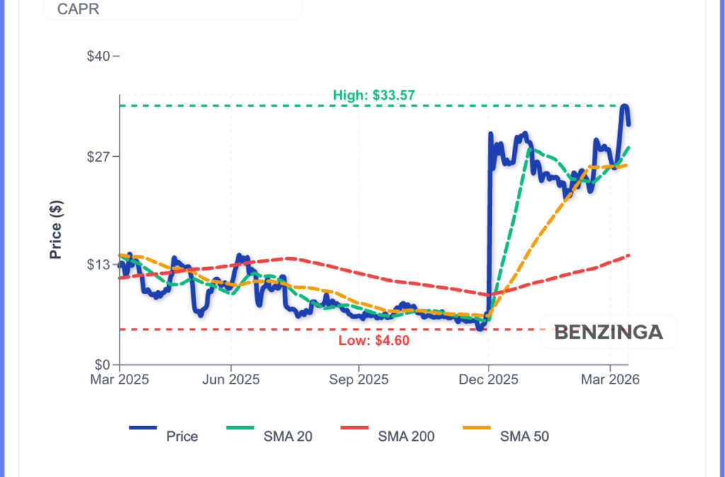 Capricor Therapeutics shares have surged over the past year, climbing from a low of about $4.60 in late 2025 to a recent high near $33.57 as momentum strengthened in recent months.