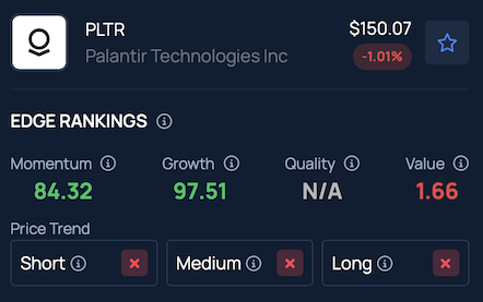 According to Benzinga Edge Stock Rankings, Palantir shares are showing a downward trend across the short, medium and long-term, although the company’s Growth score ranks in the 97th percentile.