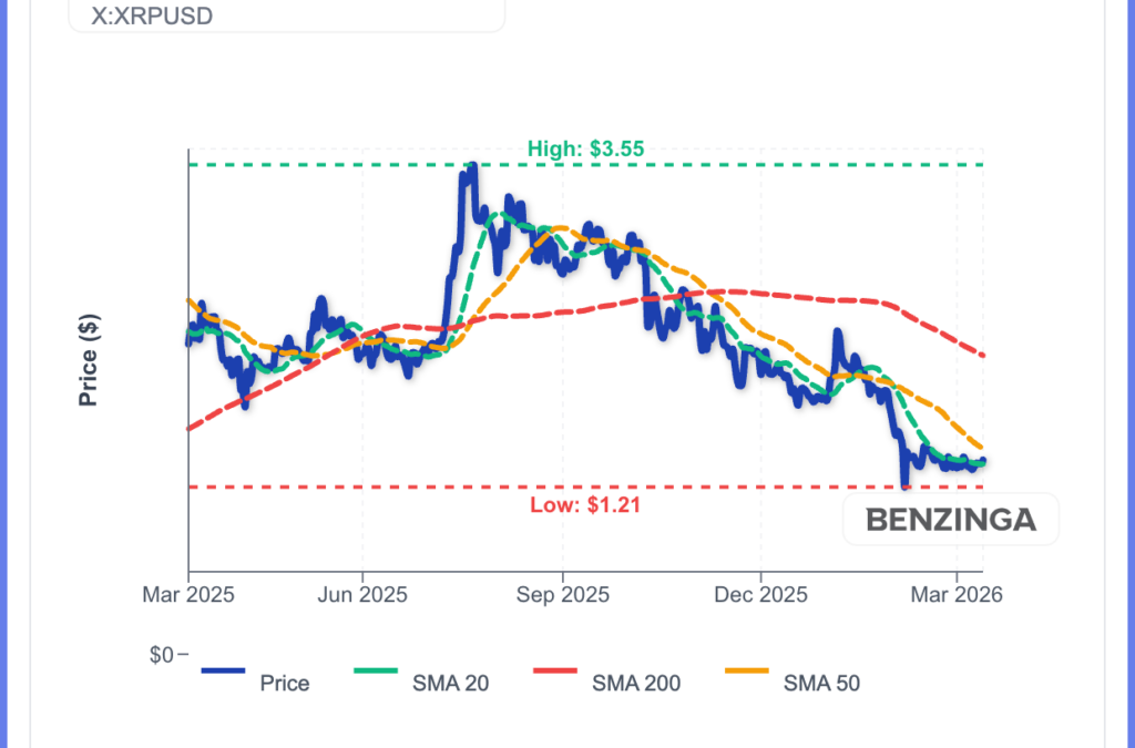 XRP bounced hard off the $1.20 area in early March and is now pushing into the upper Bollinger Band at $1.4346.