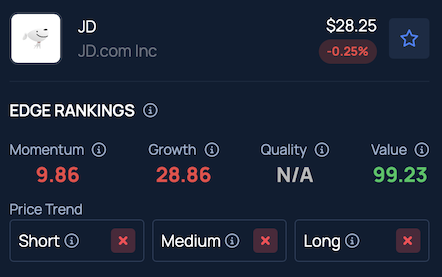 According to Benzinga Edge Stock Rankings, JD.com is showing weakness across the short, medium and long-term timeframes, although its Value score ranks in the 99th percentile.