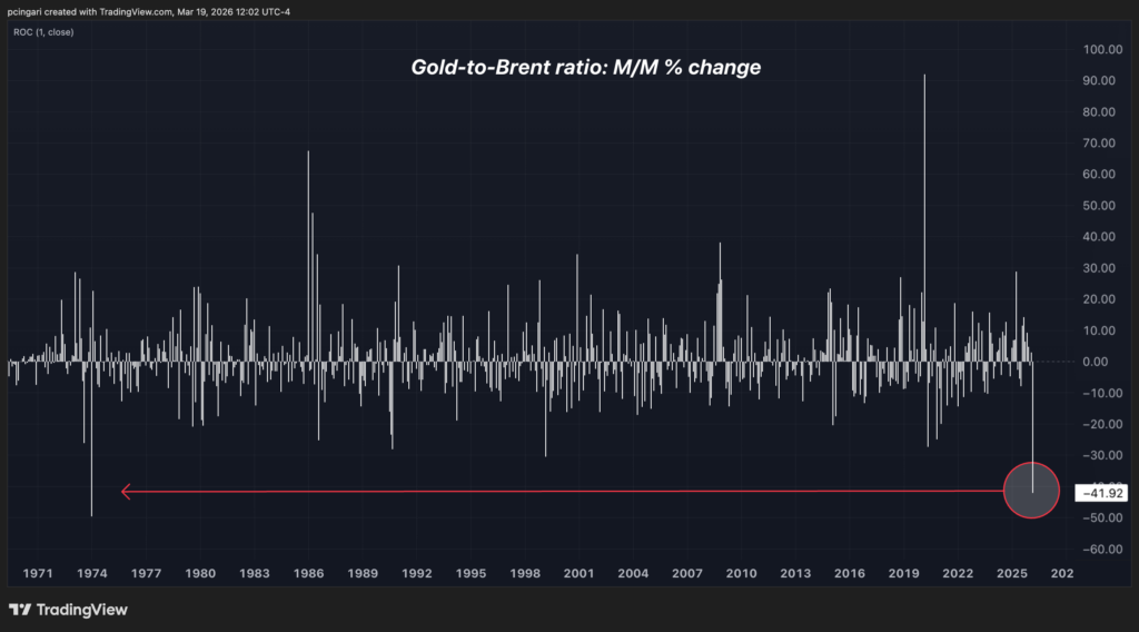 The gold-to-Brent ratio — the number of barrels of crude an ounce of gold can buy — has crashed 43% month-to-date to roughly 40.