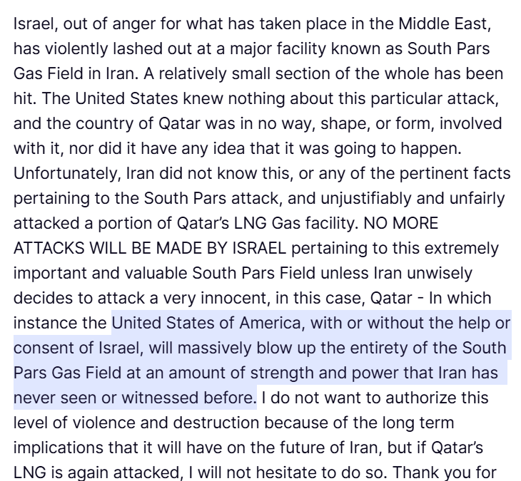 “United States of America, with or without the help or consent of Israel, will massively blow up the entirety of the South Pars Gas Field at an amount of strength and power that Iran has never seen or witnessed before,” Trump said.