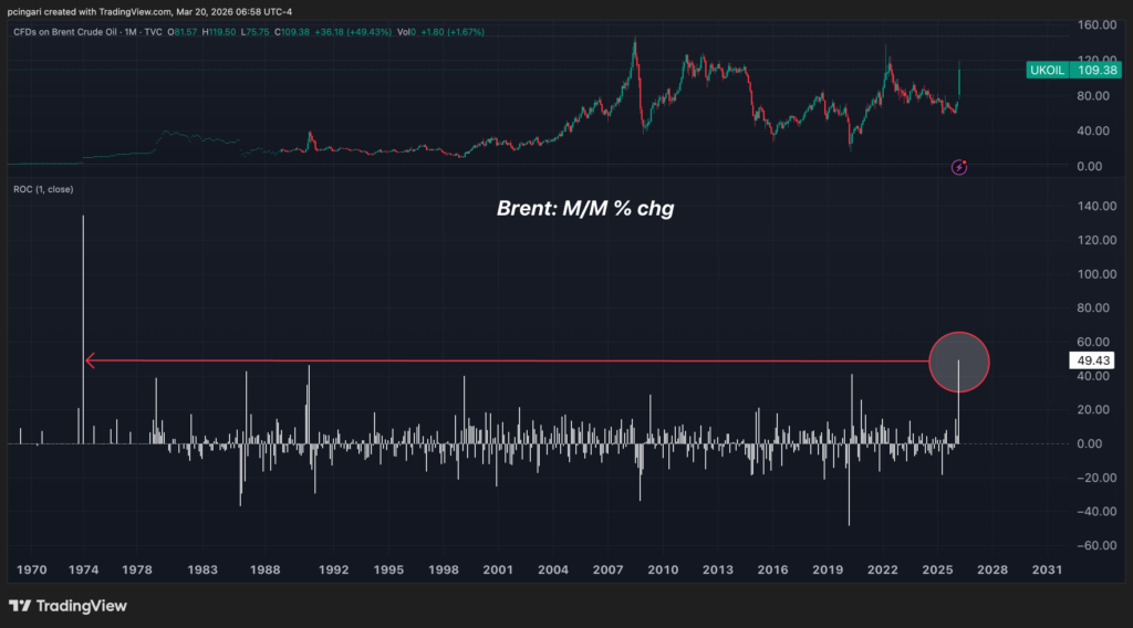 Brent crude – as closely tracked by the United States Brent Oil Fund LP, ETF (NYSE:BNO) – has surged 49% in March — the strongest monthly move since November 1973, when the Arab oil embargo sent shockwaves through a global economy that had never seen anything like it.