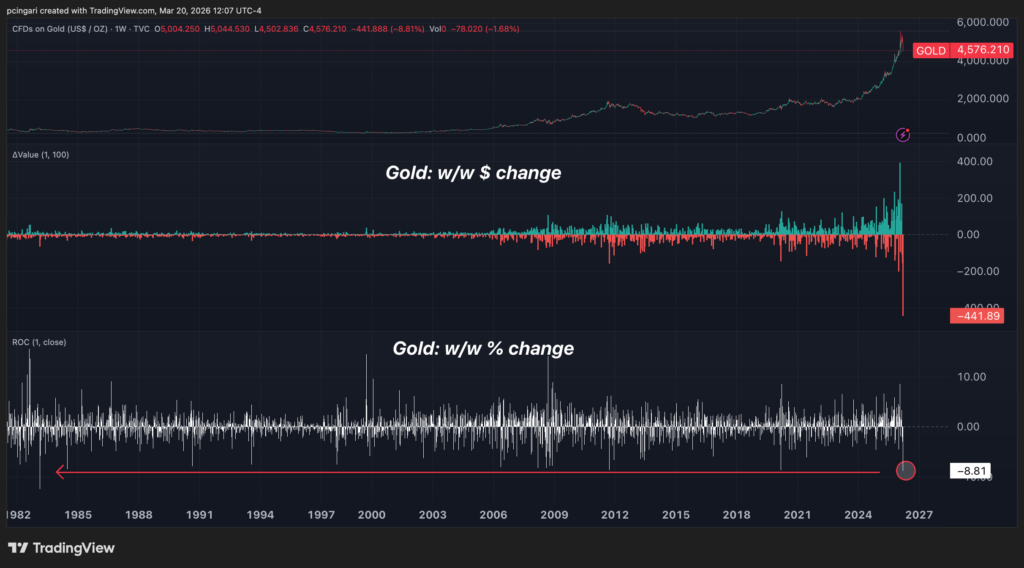 But the dollar loss is even more striking — gold has shed $441 per ounce this week, the largest weekly dollar decline in the metal’s recorded history, a direct consequence of prices that were near all-time highs when the selling began.