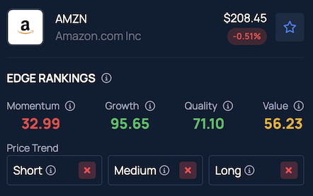 Benzinga Edge Stock Rankings indicate Amazon is lagging across short, medium and long-term performance trends. Its Quality score remains relatively solid, ranking in the 95th percentile.