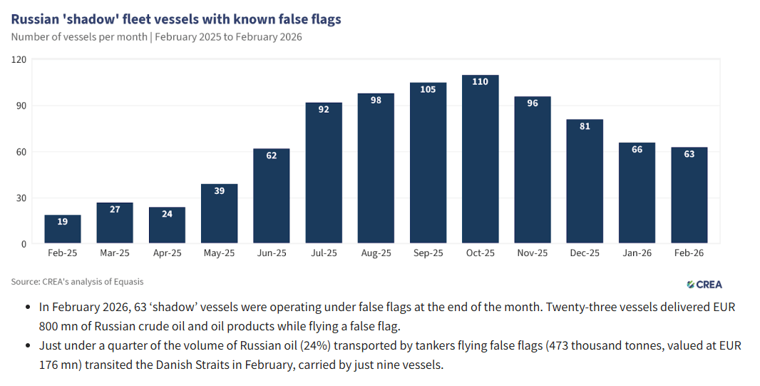 In February, 63 shadow vessels operated under false flags at the end of the month, according to CREA. Twenty-three vessels delivered €800 million worth of Russian crude oil and oil products while flying a false flag.