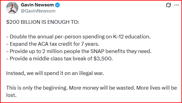 California Governor Gavin Newsom also criticized the demand, saying $200 billion could fund major domestic programs—boost education spending, extend ACA tax credits, expand SNAP benefits, and deliver middle-class tax relief—but is instead being spent on a war, with warnings of further costs and loss of life.