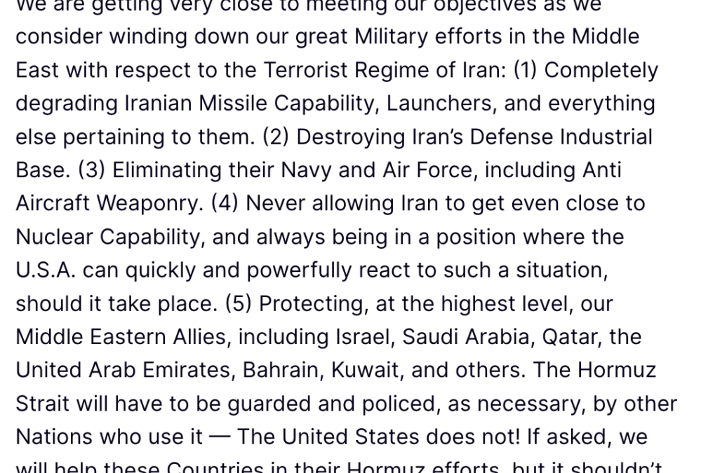 “We are getting very close to meeting our objectives as we consider winding down our great Military efforts in the Middle East with respect to the Terrorist Regime of Iran,” Trump said on Truth Social.