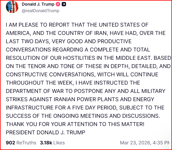 He took to Truth Social to mention that he has instructed the Department of Defense to pause any military strikes on Iranian power and energy infrastructure for five days while discussions continue, subject to the success of the discussions.