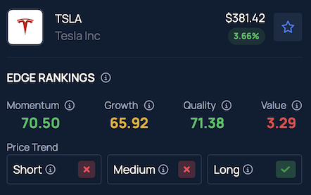 Benzinga Edge Stock Rankings suggest that Tesla Inc. stock is lagging in the short and medium term, but maintains strong long-term potential, supported by a Quality score in the 71st percentile.
