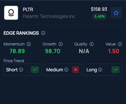 Benzinga Edge Stock Rankings show that Palantir stock has a Momentum in the 78th percentile and Value in the 1st percentile.