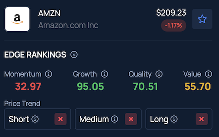 Benzinga Edge Stock Rankings show that Amazon is in a downtrend across short, medium and long-term timeframes, yet its Growth ranks in the top 5th percentile.