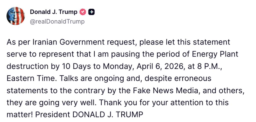 “As per Iranian Government request… I am pausing the period of Energy Plant destruction by 10 Days,” Trump wrote, adding that discussions are ongoing despite “erroneous statements” suggesting otherwise.