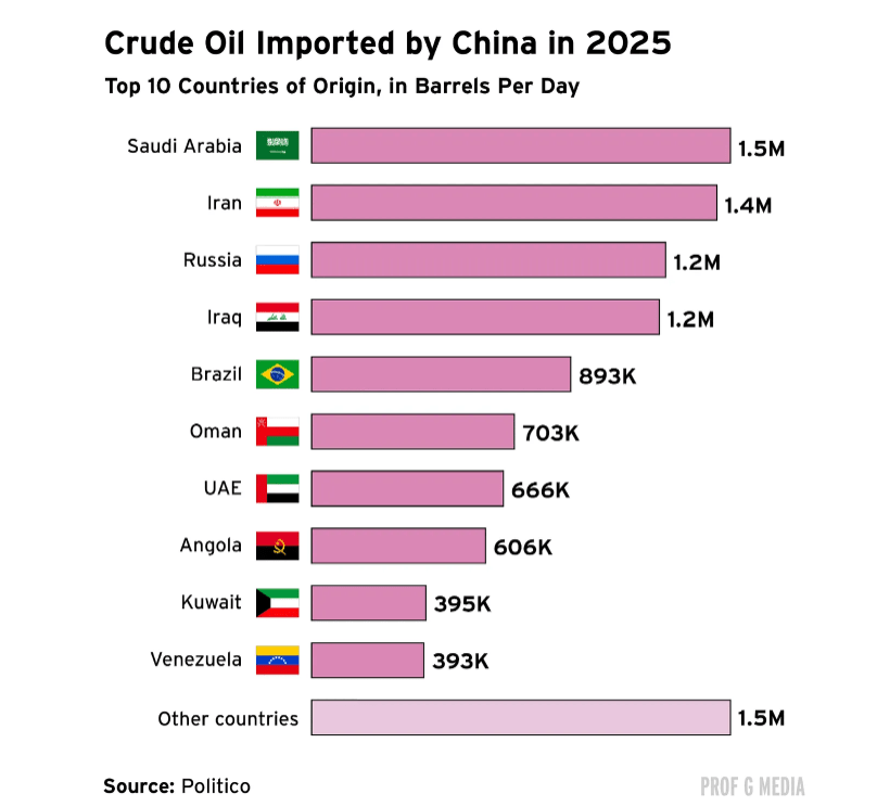 China hit record imports in 2025 of 11.55 million barrels per day and holds 90+ days of strategic reserves, though disruptions remain a risk. Russia, Brazil, and West Africa could increase shipments if Middle Eastern flows tighten.