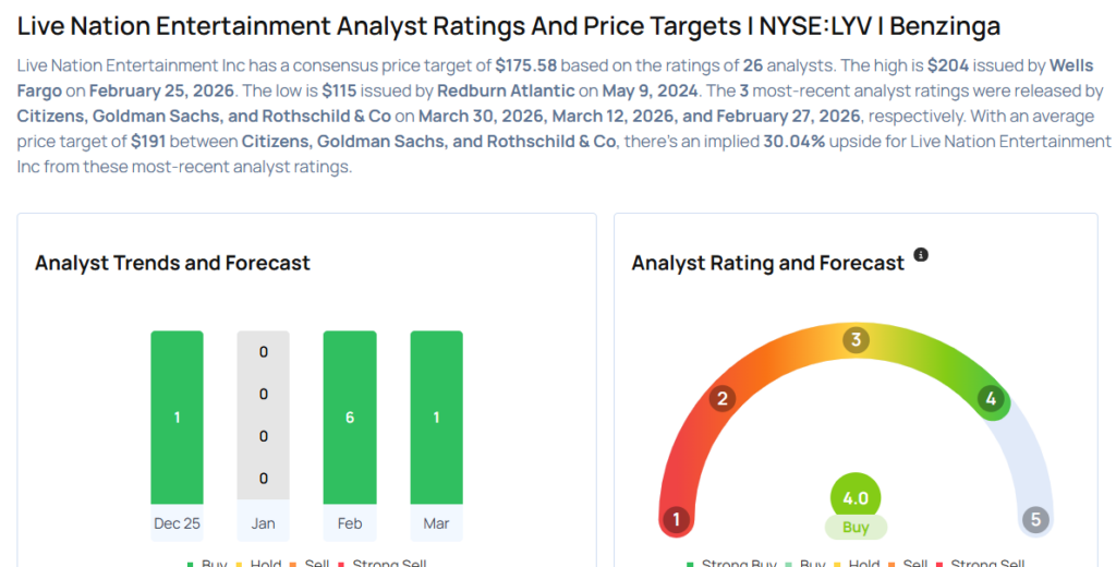 - Citizens analyst Matthew Condon initiated coverage on Live Nation Entertainment Inc (NYSE:LYV) with a Market Outperform rating and announced a price target of $190. Live Nation Entertainment shares closed at $145.71 on Friday. See how other analysts view this stock.
